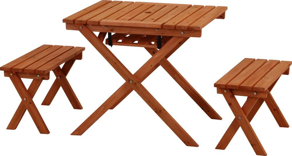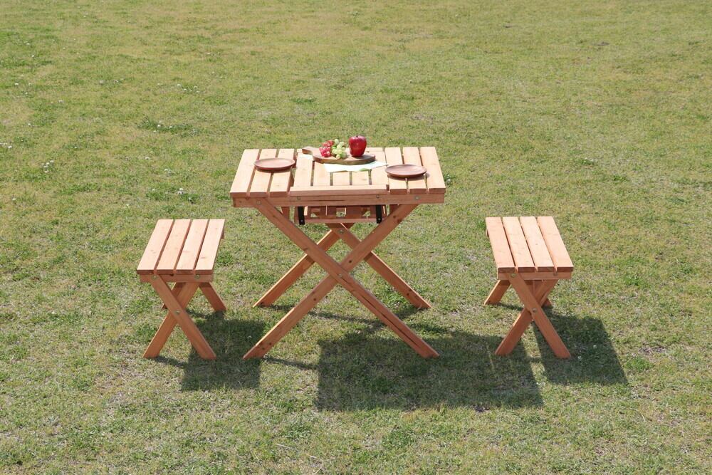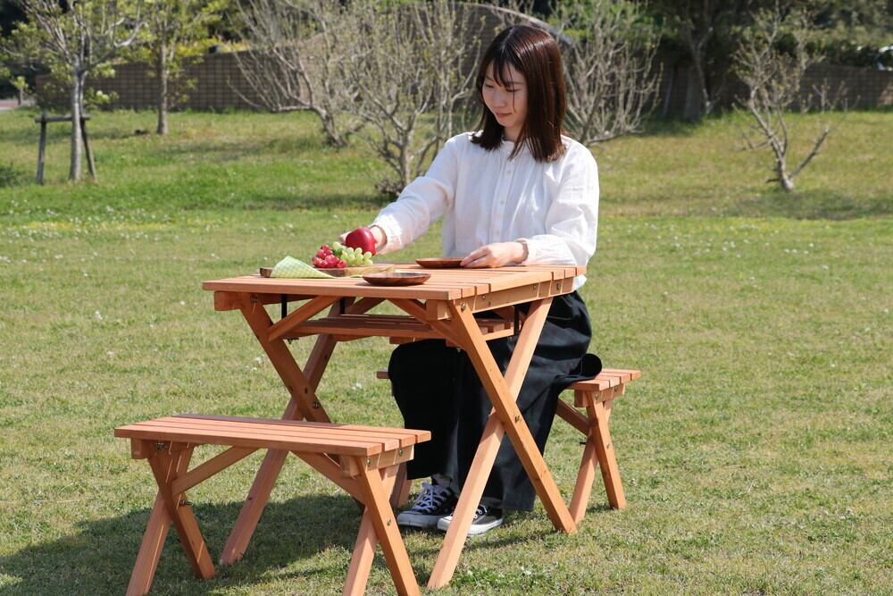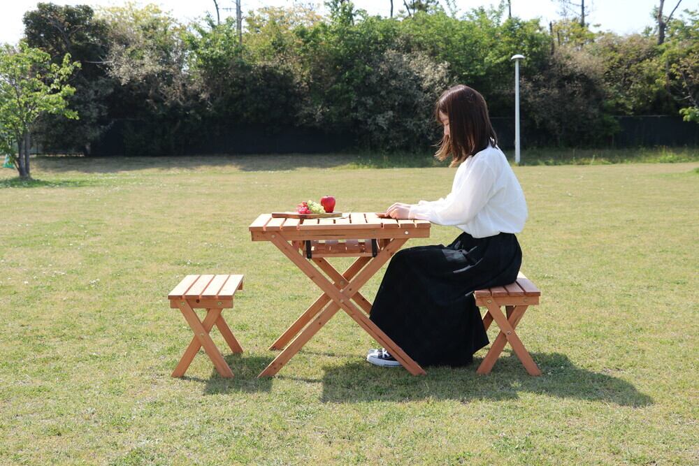 杉材を使用しているので、テーブル7kg、ベンチ2.5kgと女性でも持ち運べる重さです。