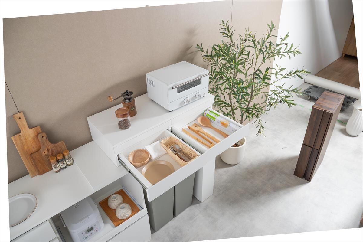 『Cammy』の魅力は、見た目の美しさだけでなく、その機能性にもあります。スライドトレーは、簡単に収納物へのアクセスを可能にし、調味料やキッチンツールをすっきりと整理できます。引き出し付きのデザインは、隠しておきたいアイテムもスッキリ収納できるため、キッチンが常にクリーンで整った印象を保ちます。