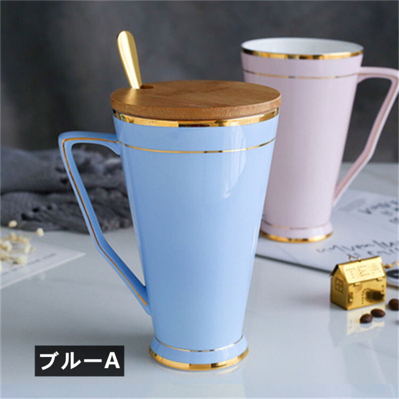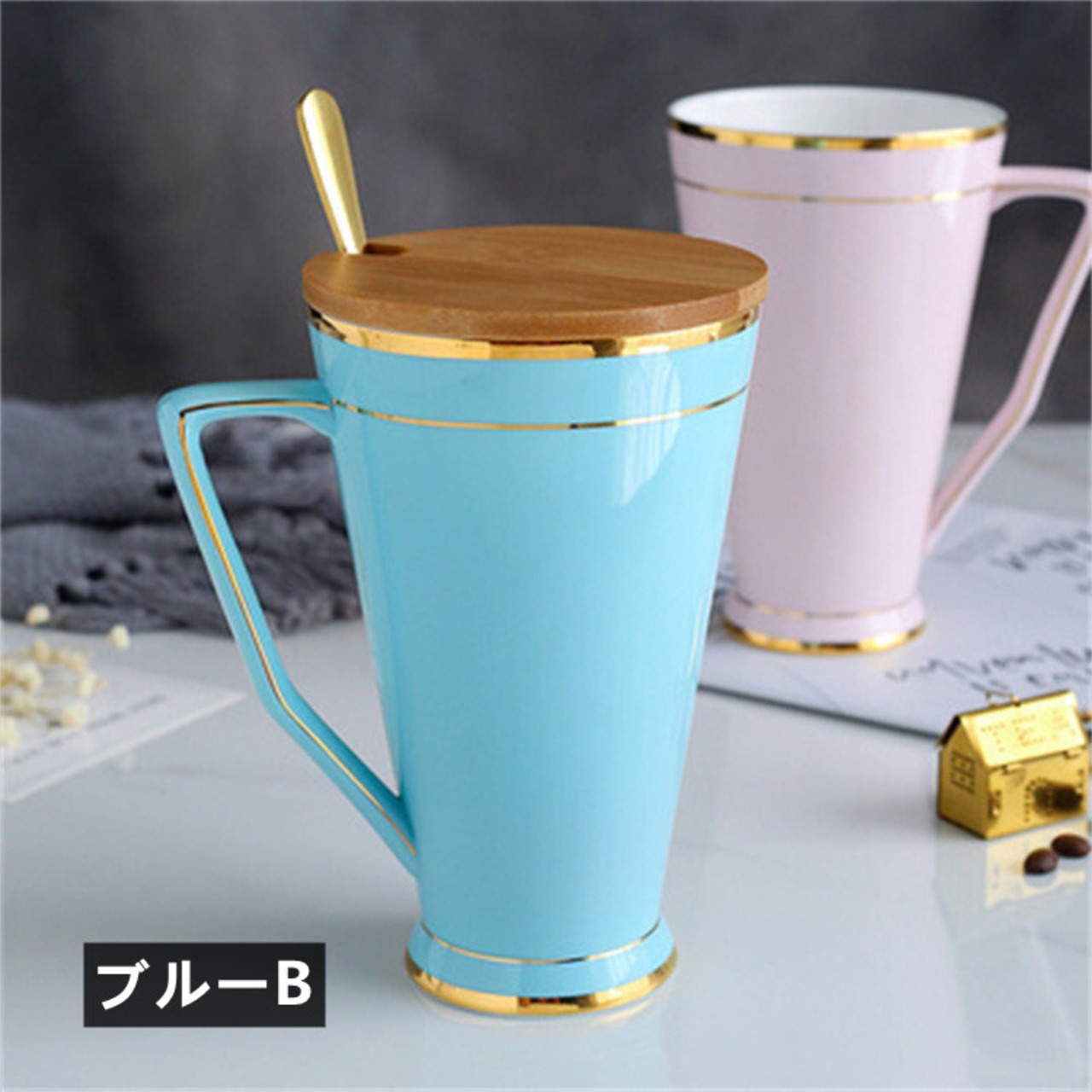 このマグカップはセラミック素材で作られており、高品質で耐久性があります。グレー、ブルーA、イエロー、ブルーB、ピンクの5つのカラーバリエーションがあり、自分の好みに合わせて選ぶことができます。