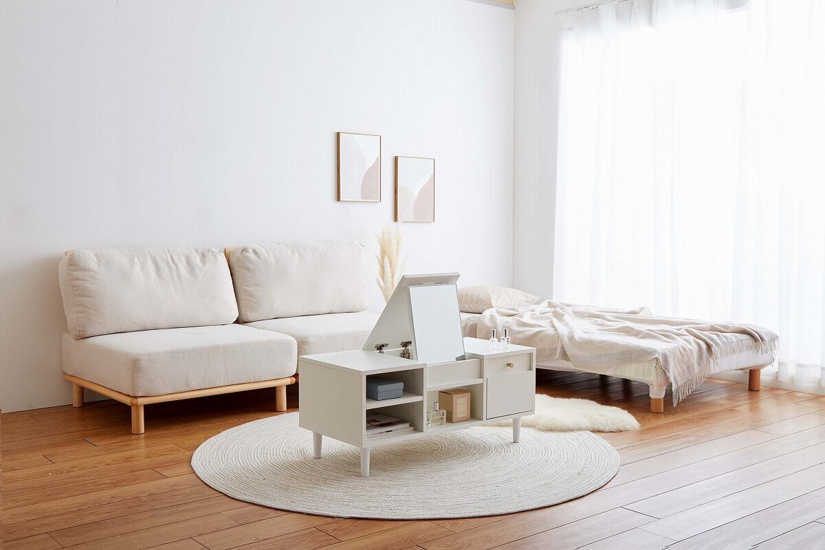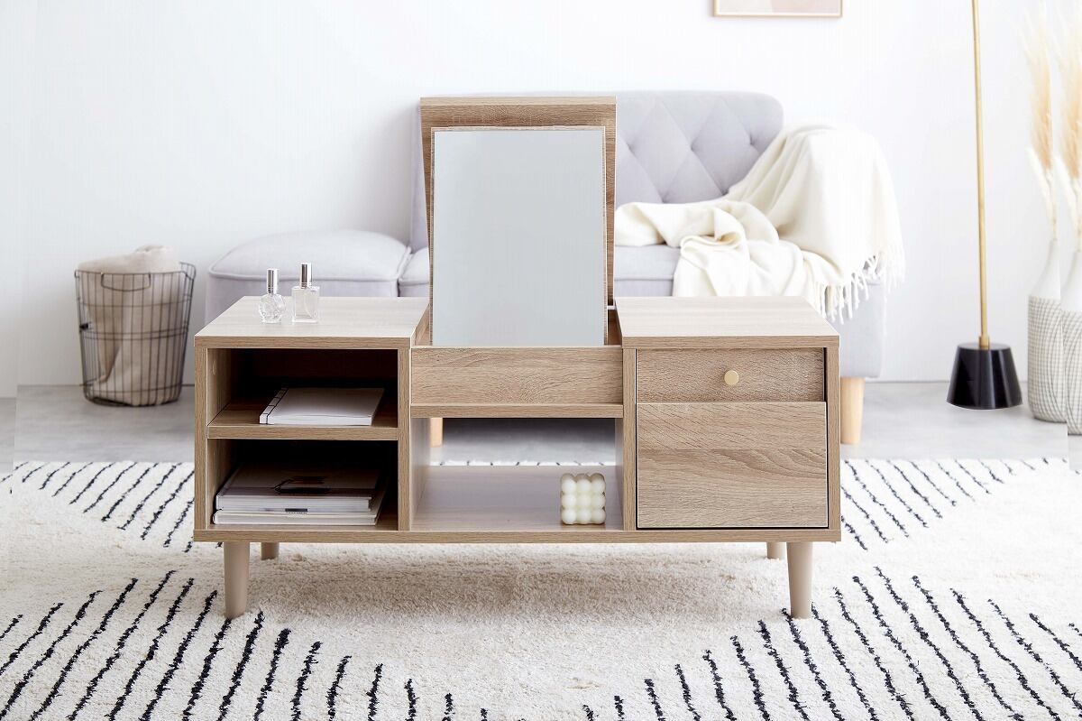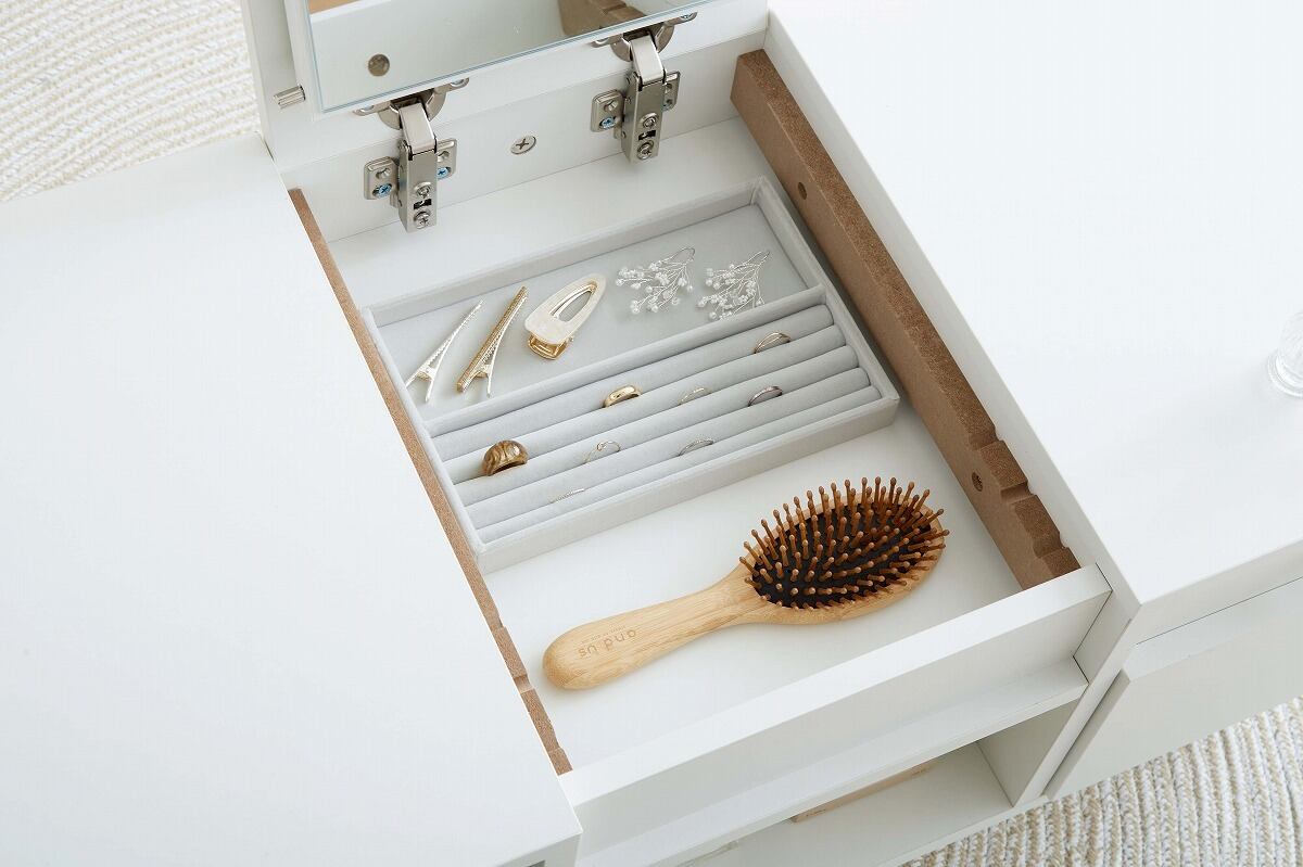 さらに、多彩な収納スペースを備えているので、化粧品やアクセサリー、文房具などをすっきりと整理することができます。細部にまでこだわったデザインは、お部屋のインテリアとしても一層の魅力を引き立てます。