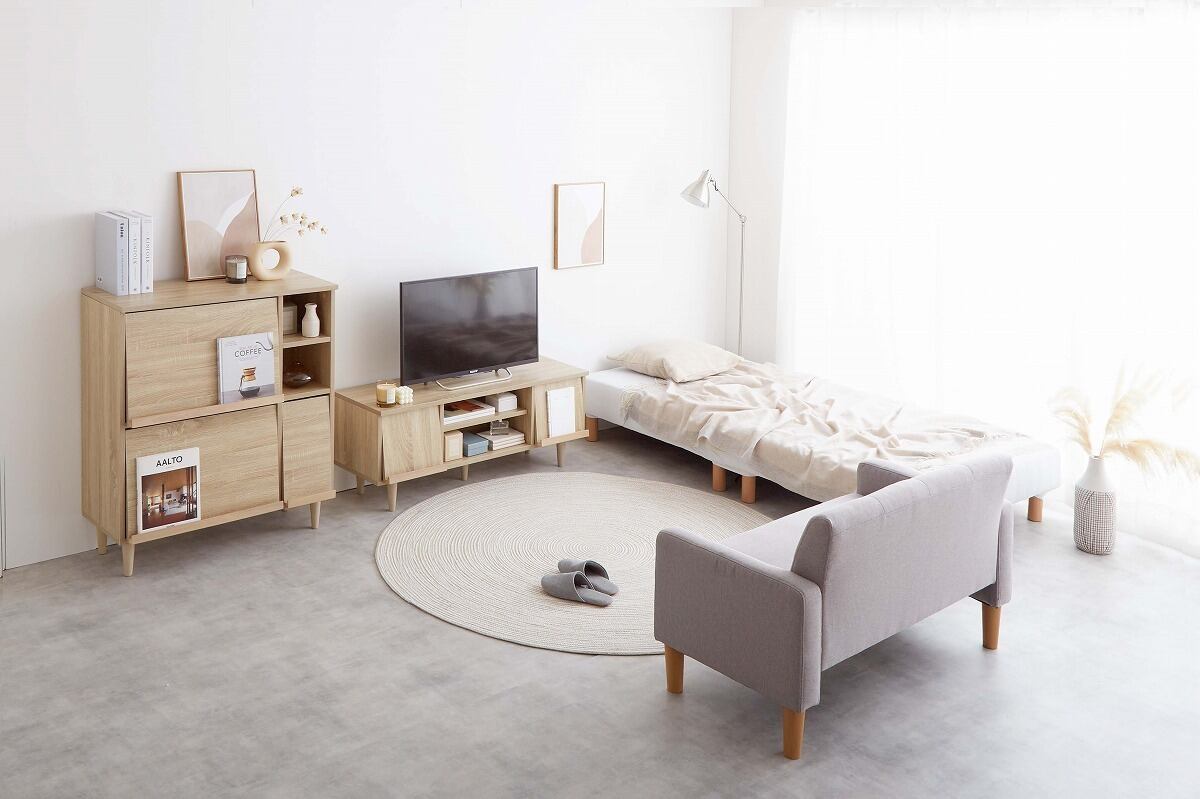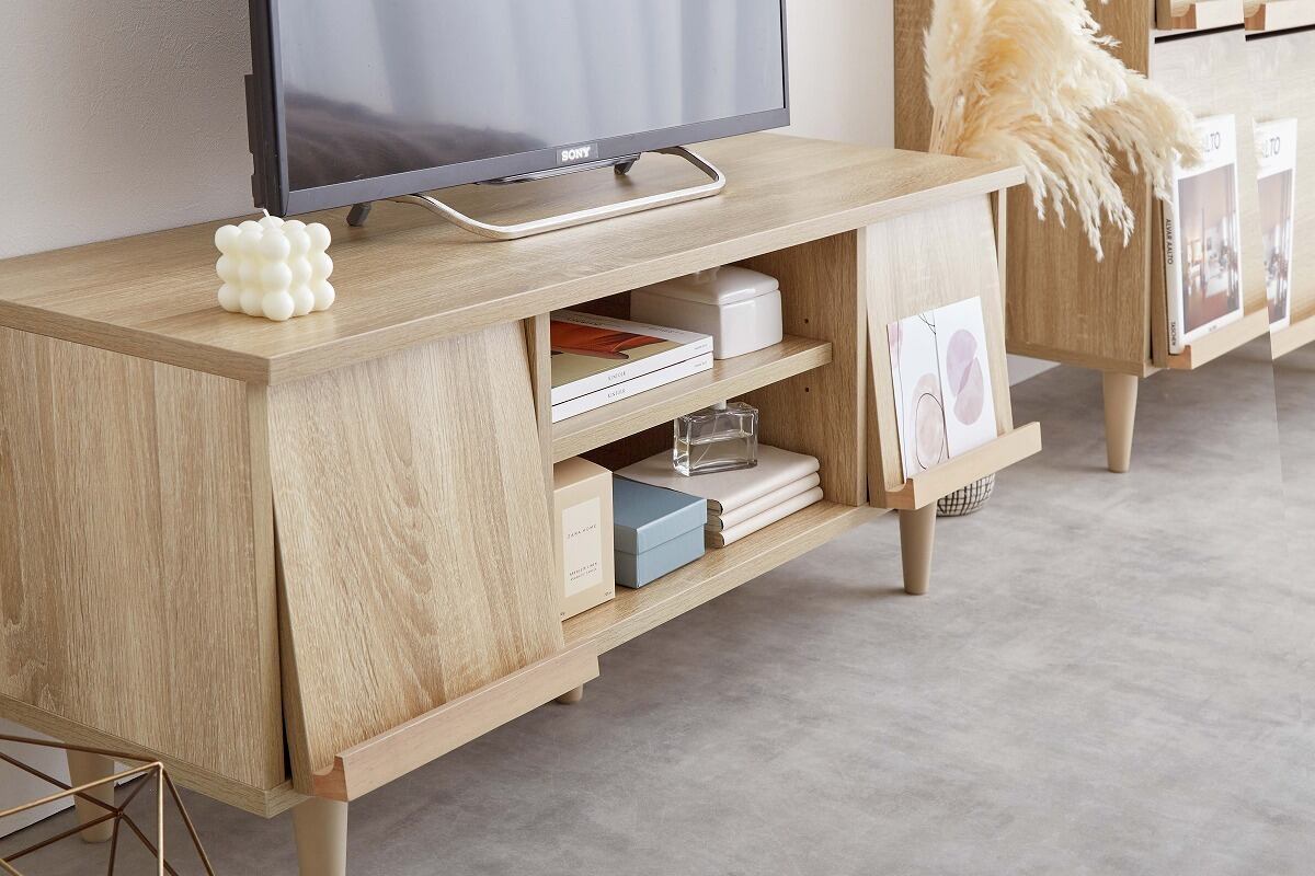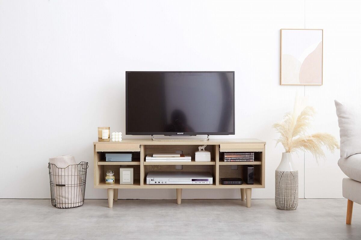 TV台の収納スペースには、テレビ周辺機器やDVDなどをすっきり収納することができ、雑多な物をスッキリと整理することができます。フラップ扉があるため、テレビを見ないときには液晶画面を隠して、生活感を抑えることができます。