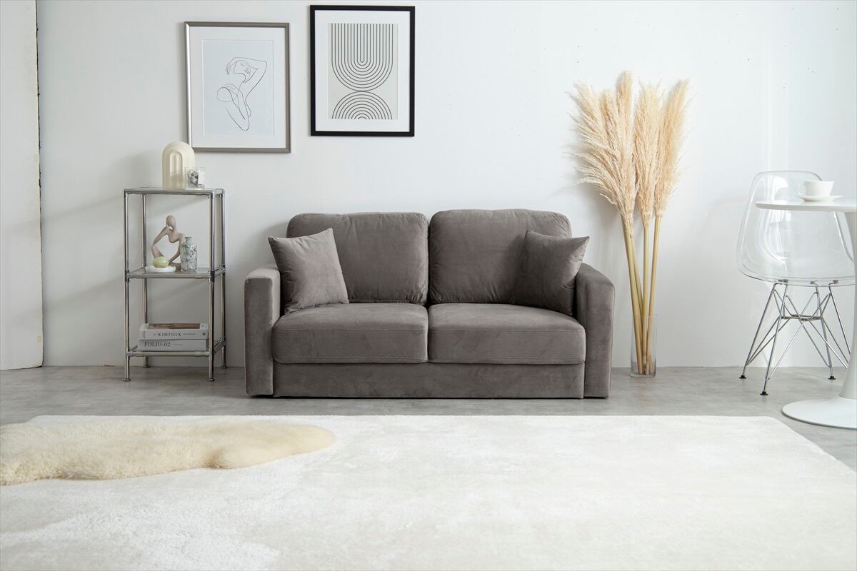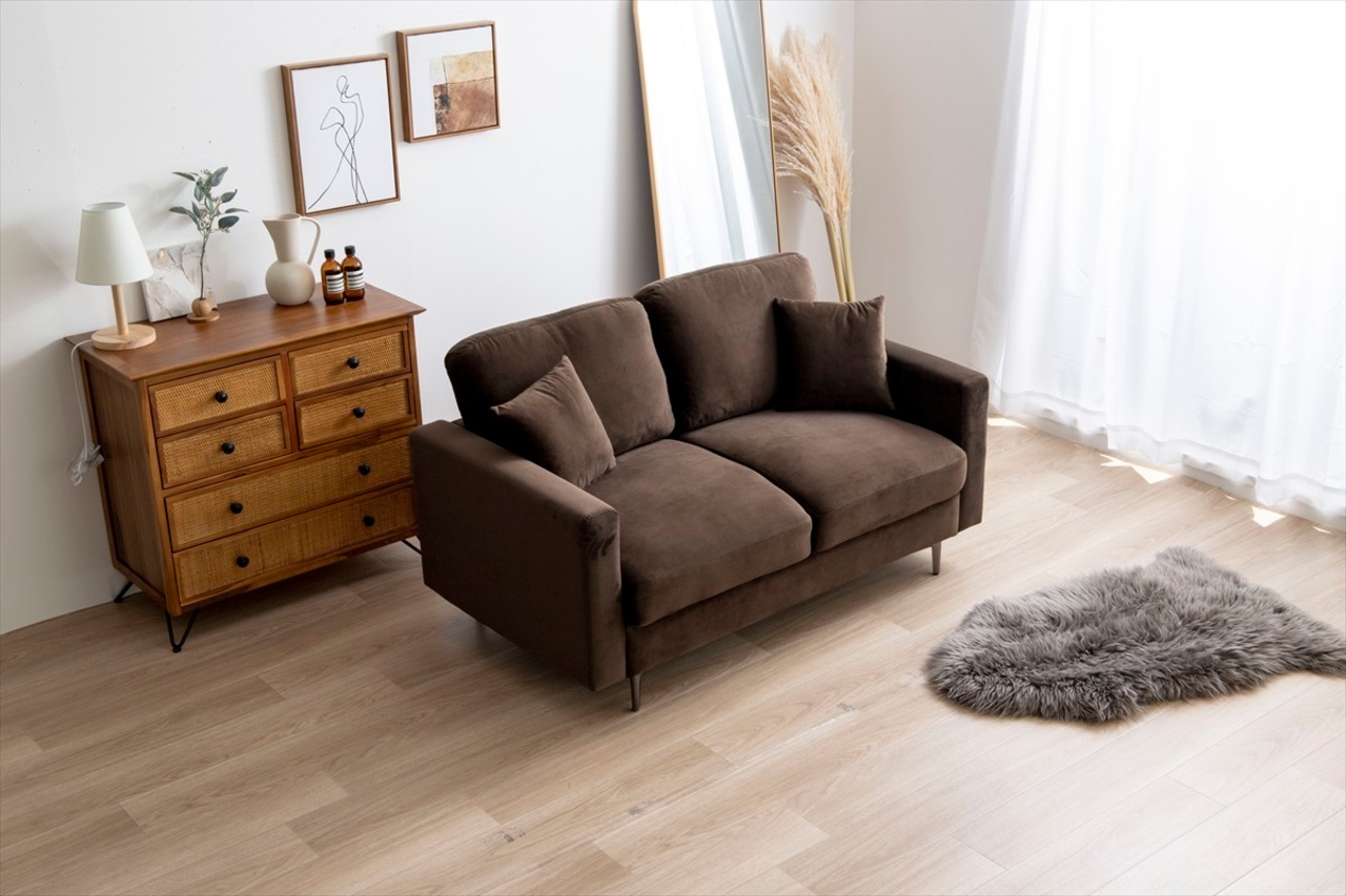 ソファの特徴は、ふかふかのベロア生地と座面のボリューム感。優れた耐久性と高級感を持ちながら、程よい柔らかさがあり、長時間座っていても疲れません。また、しっかりとしたクッション性があるため、腰や背中への負担も軽減します。