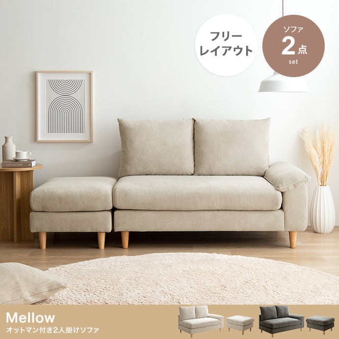 【2点セット】Mellow オットマン付き2人掛けカウチソファ