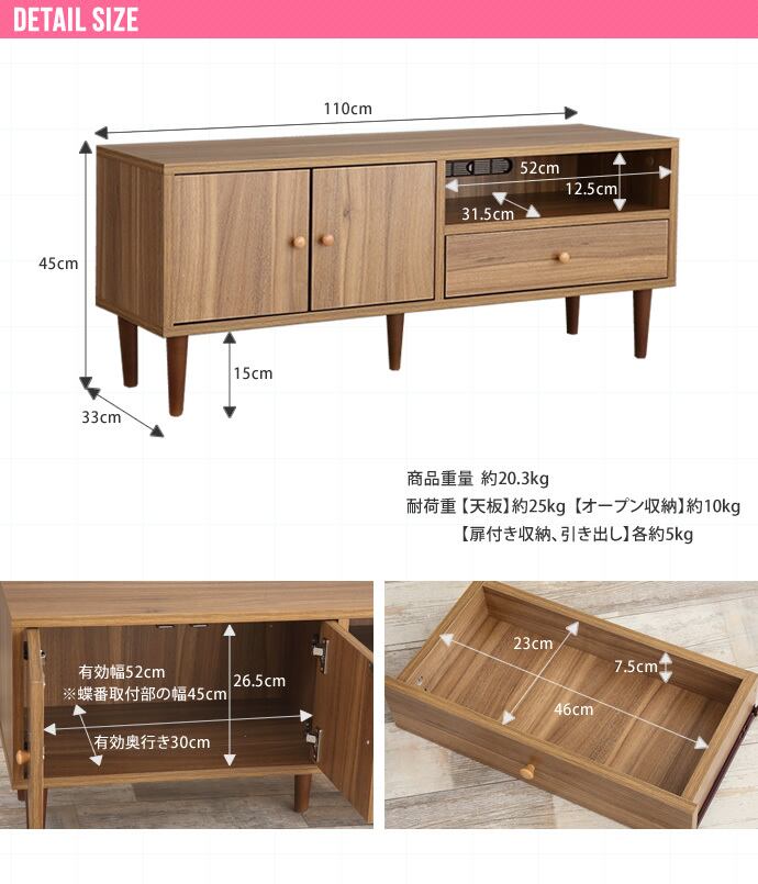 【耐荷重】天板 約25kg、オープン収納 約10kg、扉付き収納、引き出し 各約5kg
