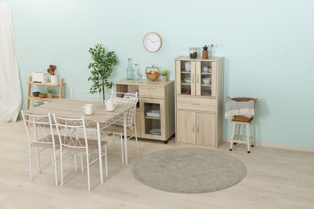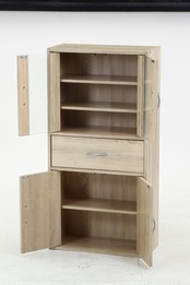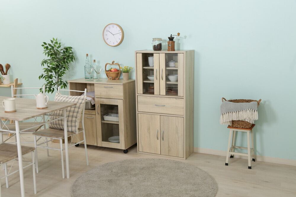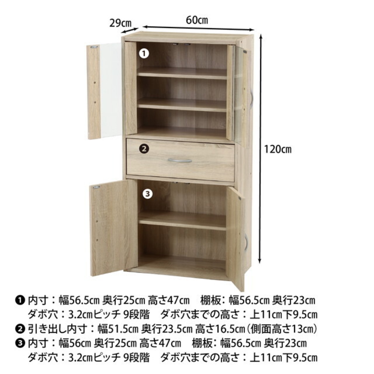 ○表面材:プリント紙化粧繊維板 ○扉部:ガラス ○取っ手:プラスティック