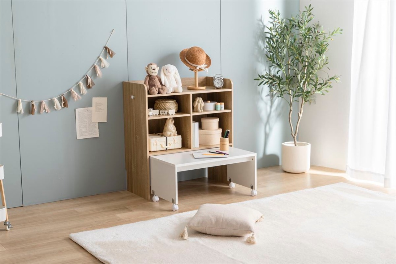 機能的でスペースを有効活用できるPilaのマルチ収納・デスク付きランドセルラック。幅80cmの広々としたスペースは、お子様のおもちゃや教材、ランドセルなどをまとめて収納するのに最適です。さらに、上部にはデスクが付いているので、お子様が勉強や遊びを楽しむスペースとしても活用可能です。