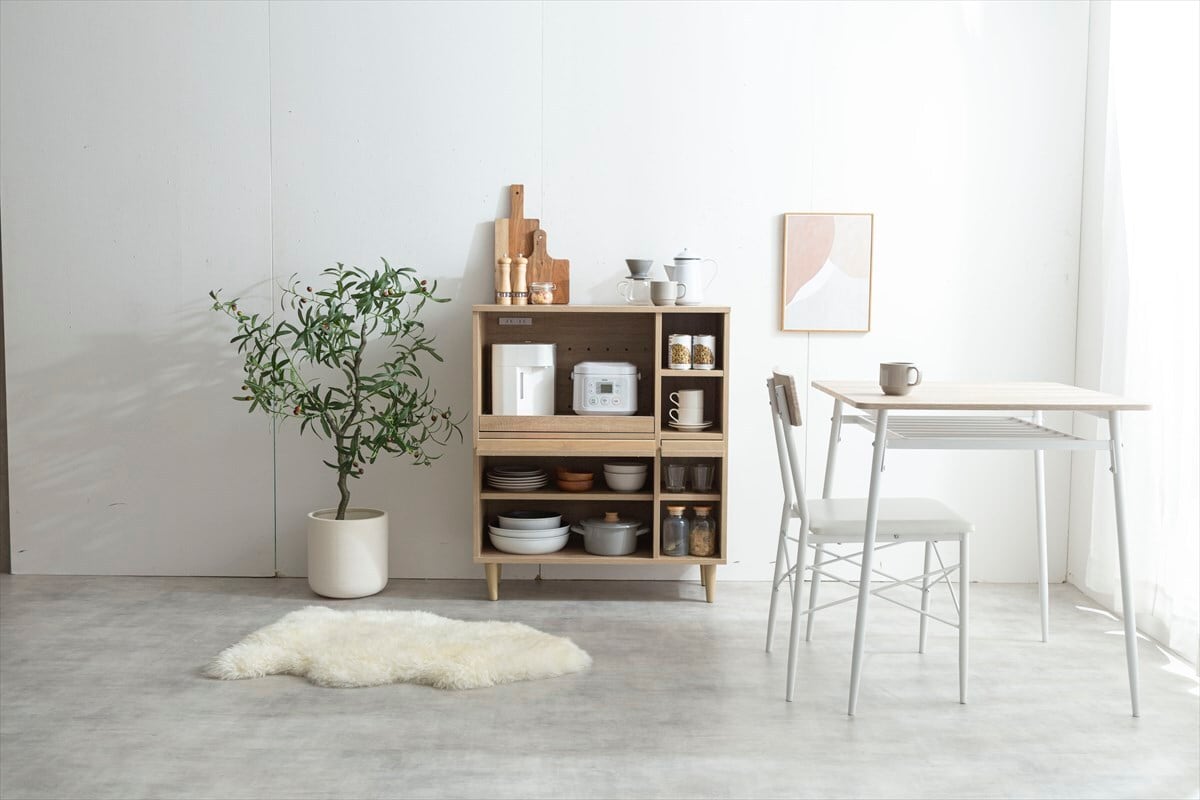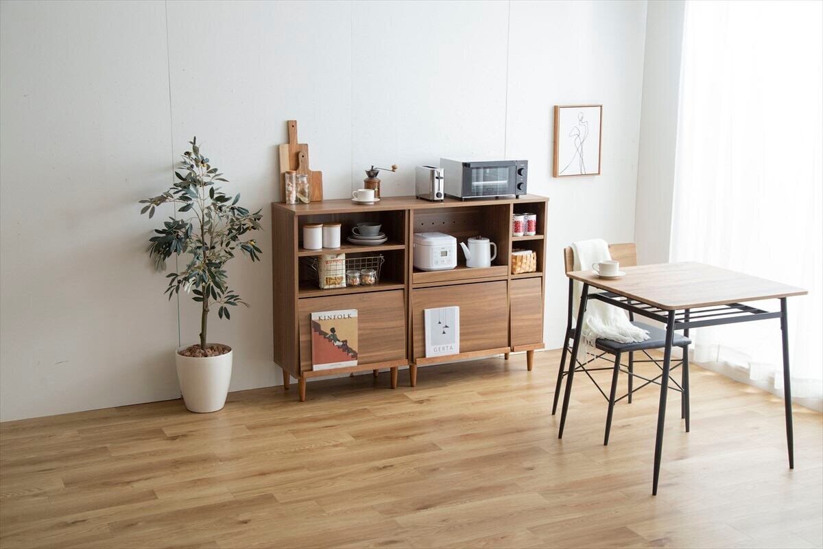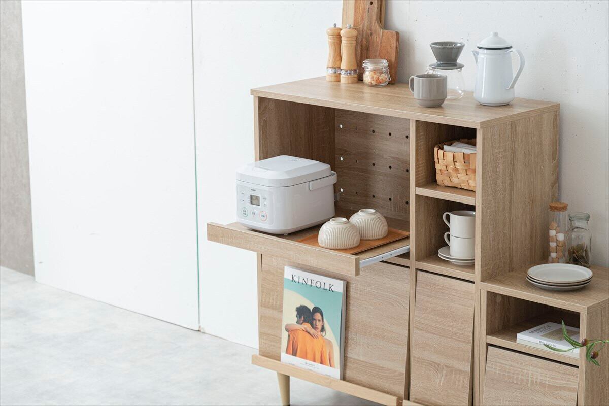 友人を招いての料理パーティや、家族みんなでの食事タイムをおしゃれに演出するには、収納家具も重要です。Tony フラップ扉レンジ台は、幅広のスペースでレンジや調理器具をスッキリ収納できるだけでなく、フラップ扉のデザインで生活感を隠しておしゃれな空間を実現することができます。