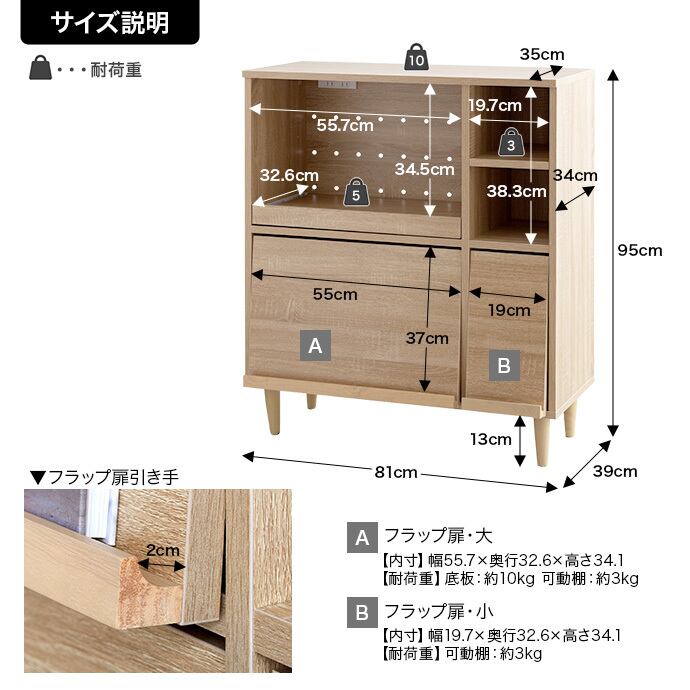 【耐荷重】天板:約10kg 、スライドトレー:約5kg、オープン収納可動棚:約3kg、フラップ扉・大可動棚:約3kg、フラップ扉・大底板:約10kg、フラップ扉・小可動棚:約3kg