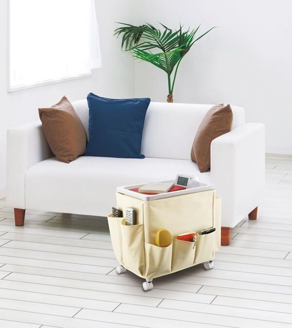 ティッシュや新聞、リモコンなどソファや座椅子のそばにあると便利なものをまとめて収納できるサイドテーブルワゴン。