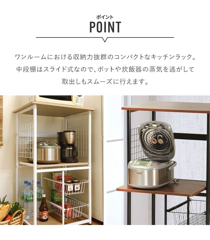 スタイリッシュで機能的な「キッチンラック」は、ハイタイプのレンジラックとして特におすすめです!スタンダードなデザインながら、スライド式の中段棚を搭載し、ポットや炊飯器からの蒸気を逃がしつつ、取出しもスムーズに行えます。調理器具をすっきり整理整頓することで、キッチンをより快適な空間にアップデートします。