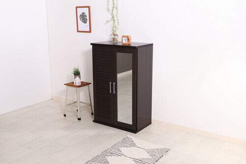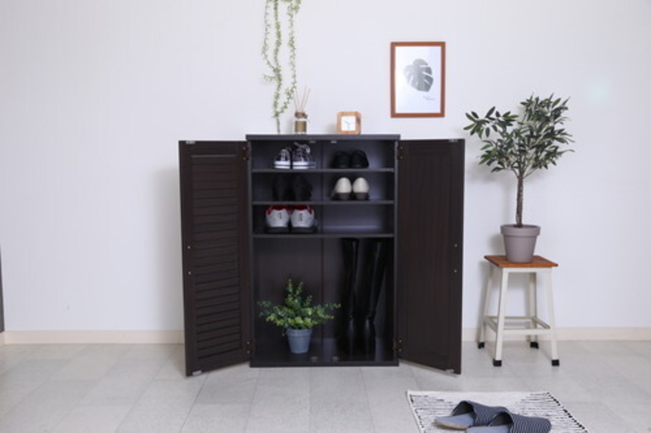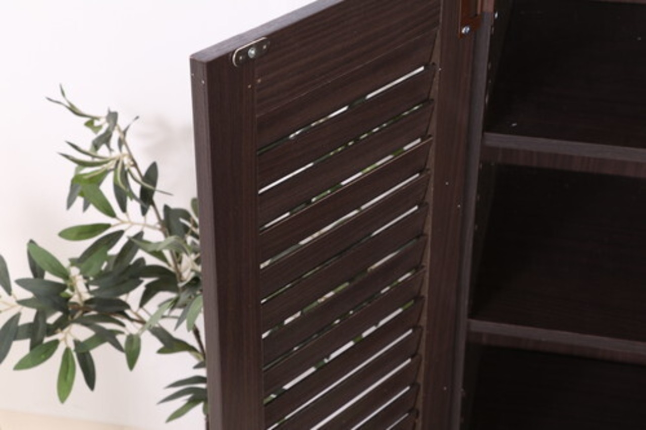 通気性が良く、においがこもりにくいルーバー扉仕様なので、大切な靴を清潔に保つことができます。また、ミラー付き設計で、出かける前の身だしなみチェックも簡単に行えます。